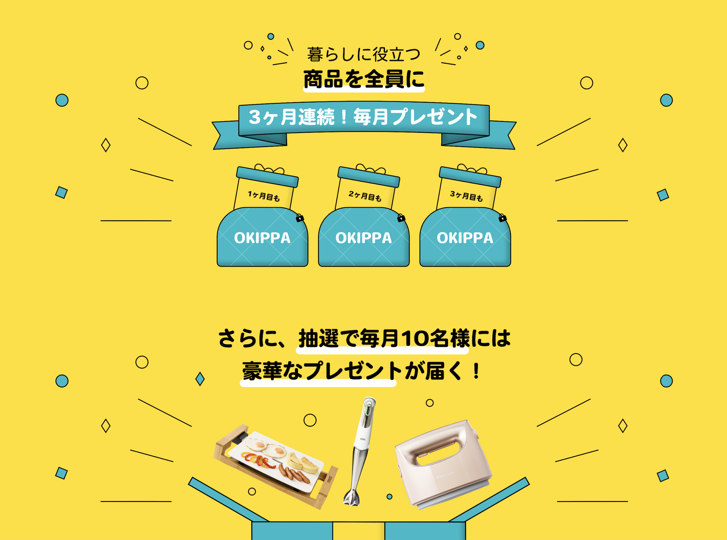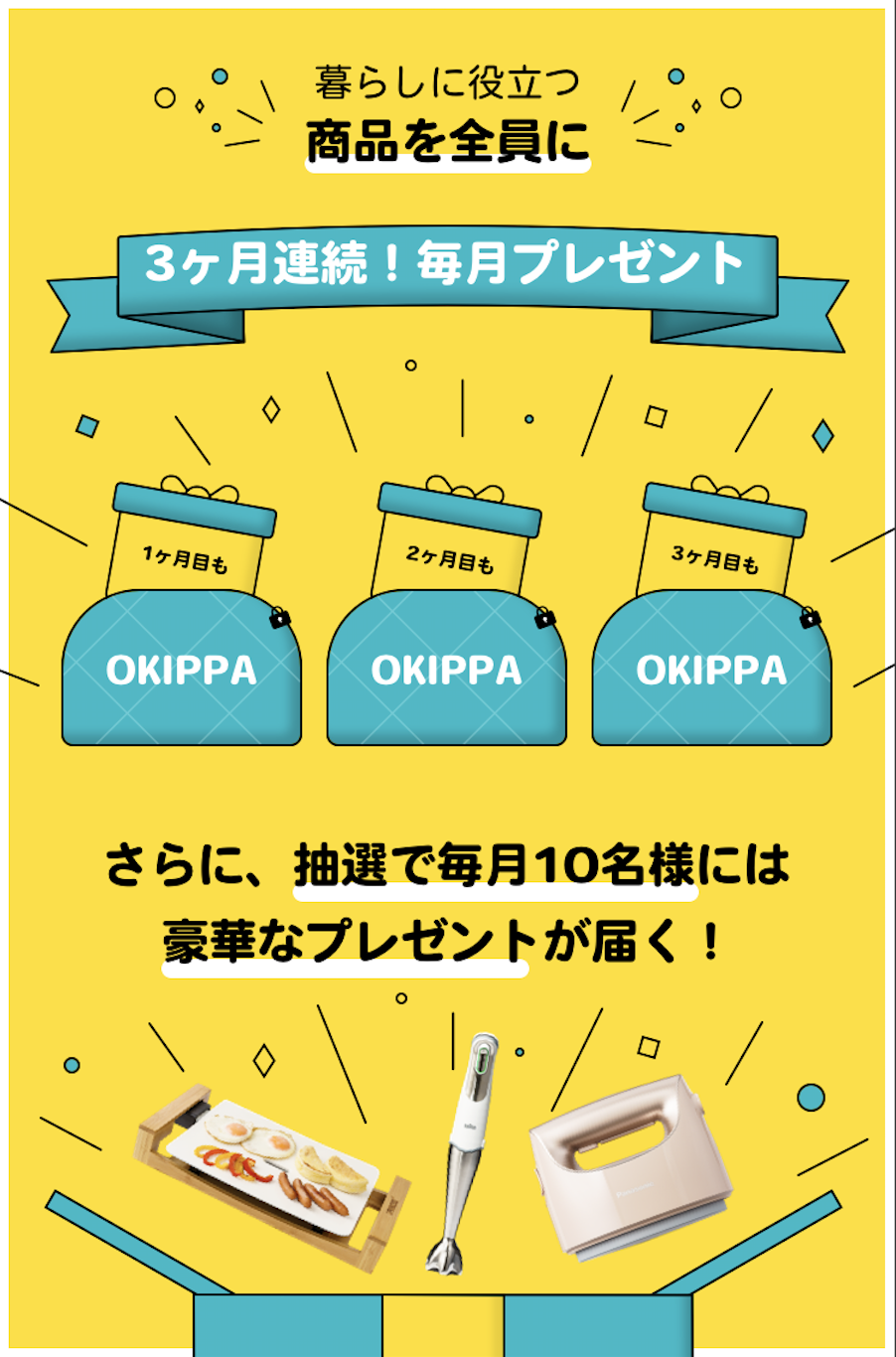 ※『特典その2』『特典その3』の商品発送は、OKIPPAバッグへの配達指定(チャイムを鳴らさない場合もございます)での発送になるため、予めOKIPPAバッグの設置をお願い致します。OKIPPAバッグ設置のタイミングにつきましては、お申込み時ご登録頂いたメールアドレスにご案内致します。